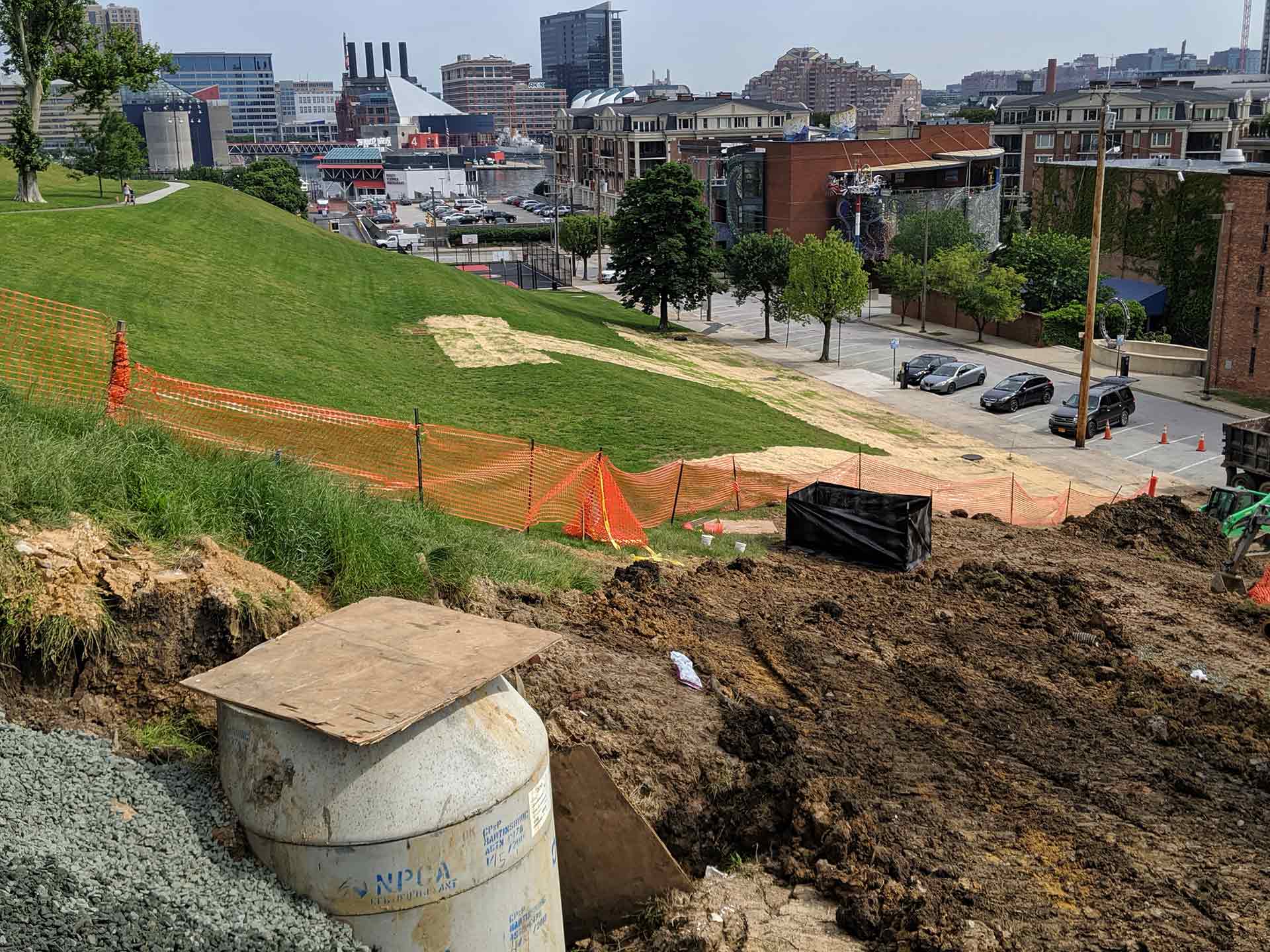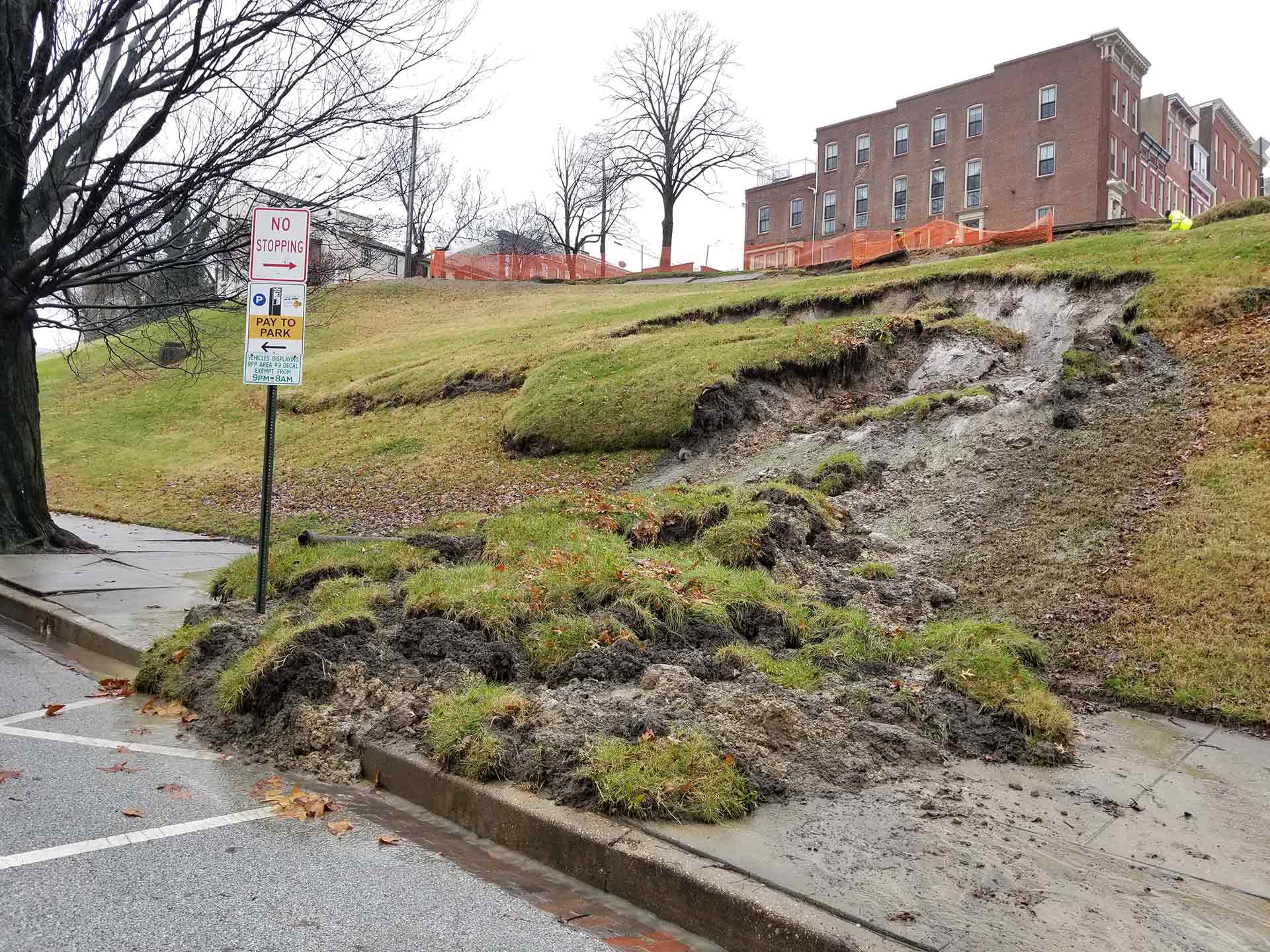 Federal Hill, a historic park in Baltimore, Maryland which was used as a fort during the Civil War and was mined for sand and clay routinely experiences shallow slumping, signs of minor slides, erosion, and perpetually wet areas along the grassy slopes.