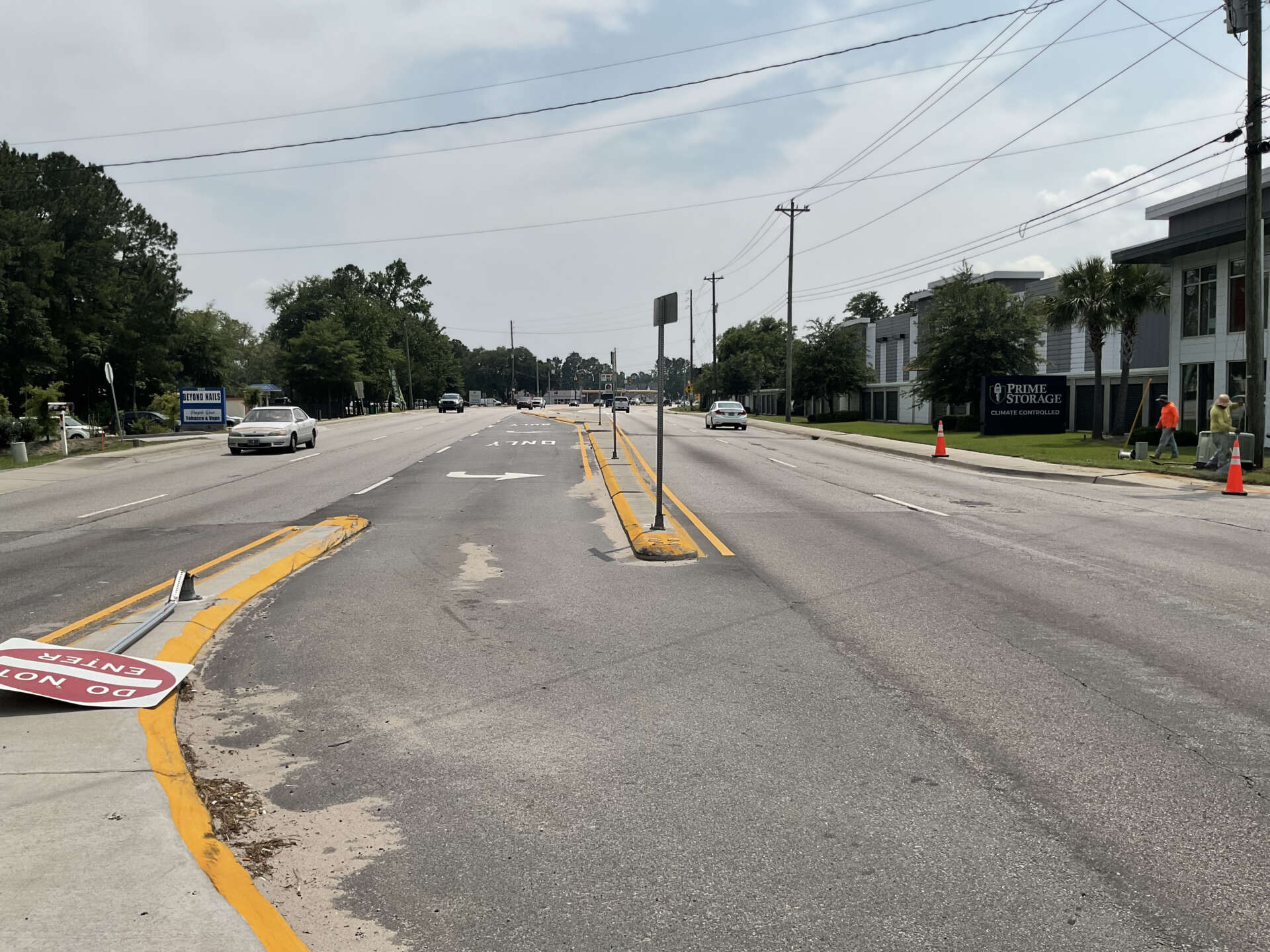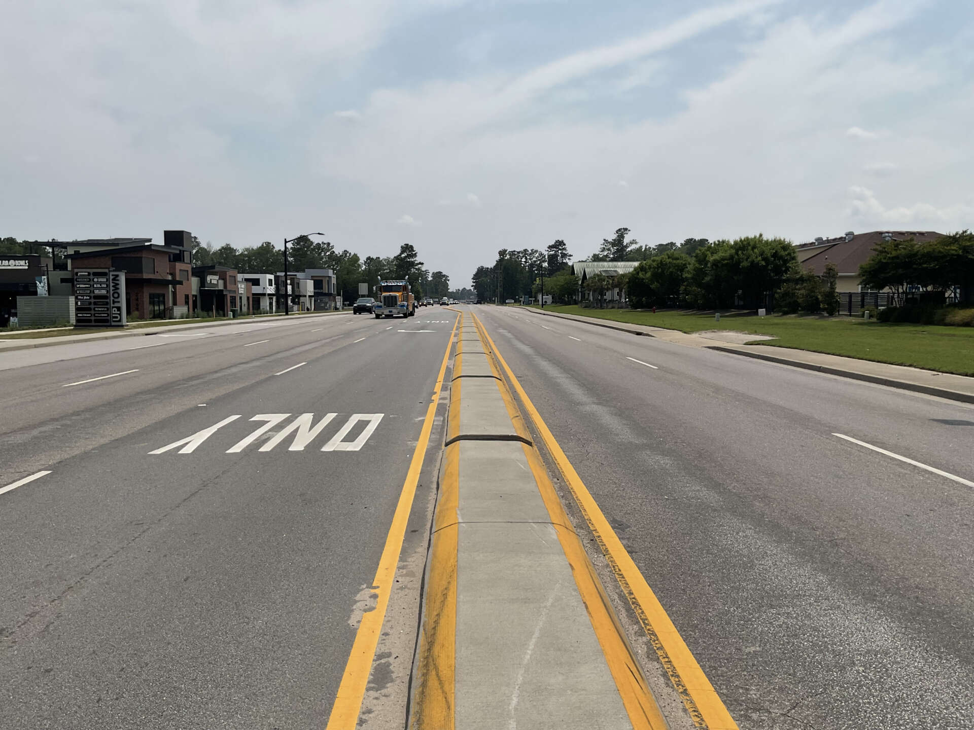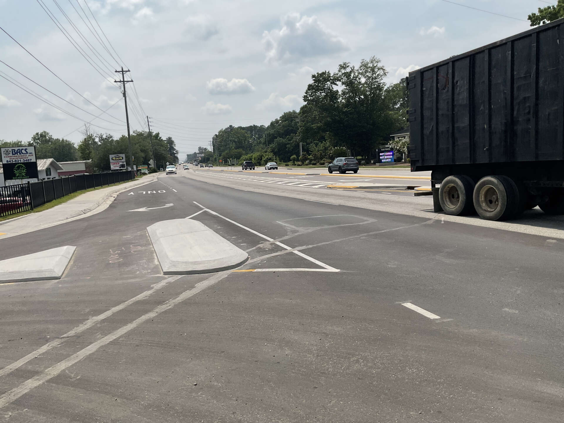 RK&K’s design included a concrete median, converting the painted median to a raised one. To facilitate business access, multiple unsignalized restricted crossing u-turns (RCUTs) were added within the raised median based on owner feedback and SCDOT District input. The crown of the road was in the median, which posed drainage challenges. To mitigate drainage issues, the raised median included flumes to direct stormwater, and left turn lanes included cross slope corrections to eliminate stormwater ponding.